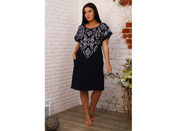 Туника женская со спущенным рукавом и манжетом. Горловина обработана кантом. Карманы в боковых швах. Низ изделия обработан плоским швом. По верху полочки оригинальный принт в геометрическом стиле с блеском.