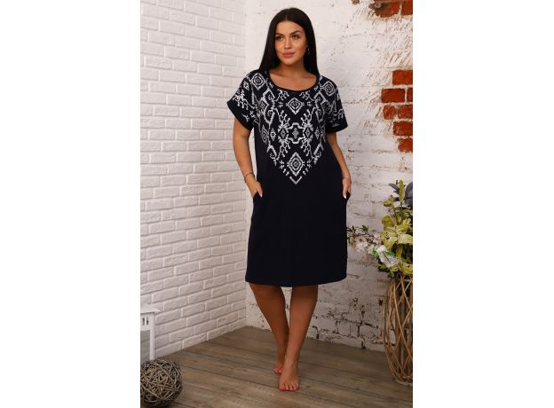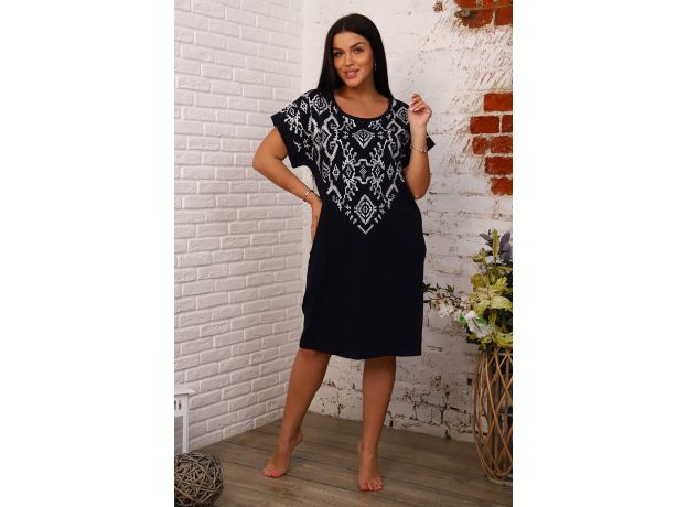Туника женская со спущенным рукавом и манжетом. Горловина обработана кантом. Карманы в боковых швах. Низ изделия обработан плоским швом. По верху полочки оригинальный принт в геометрическом стиле с блеском.
