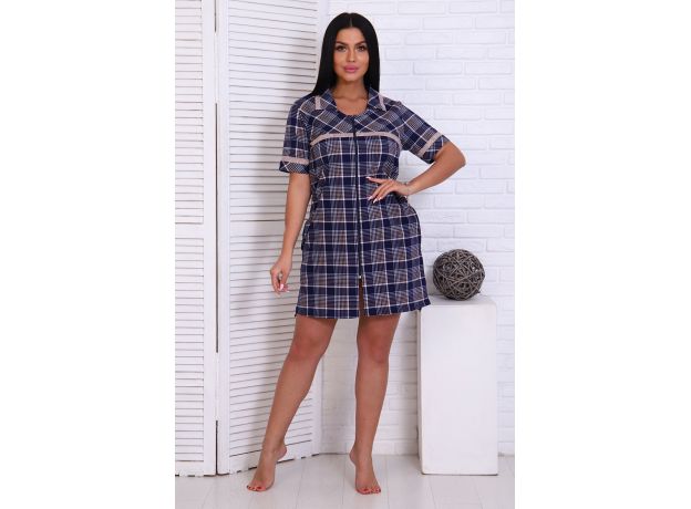 Туника на молнии для дома, дачи и отдыха, полуприлегающего силуэта с рукавом по локоть. На воротнике, кокетке и рукаве находится отделочный элемент из ткани-компаньона. Карманы расположены в боковых швах. Туника с небольшими разрезами по бокам и слегка удлиненной спинкой.