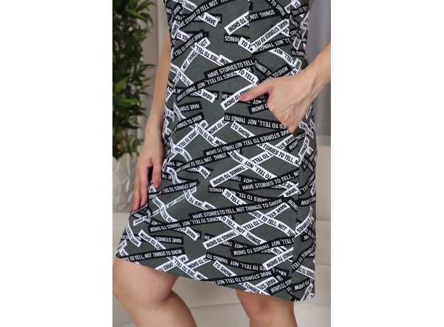 Туника женская из 100% хлопка. Длина изделия чуть выше колена с коротким рукавом. На полочке на уровне груди от рельефа к рельефу находится планка, отделанная узким кантом, а с левой стороны пришиты 3 декоративных пуговки. Рельефы идут от проймы до бока, в них находятся внутренние карманы.