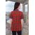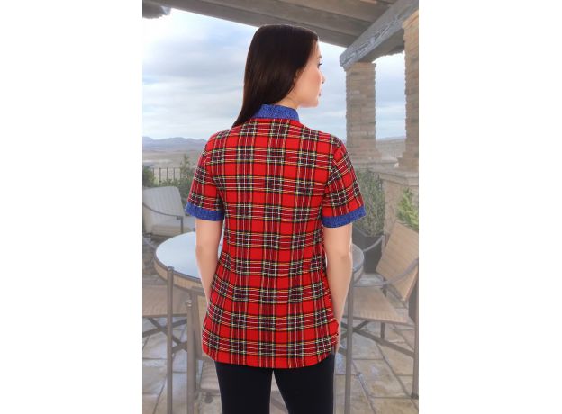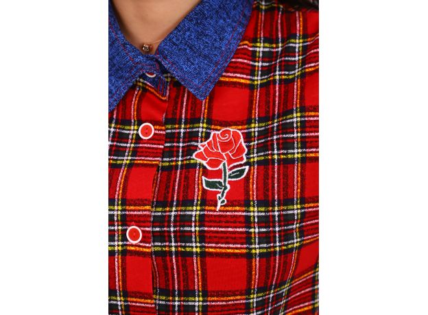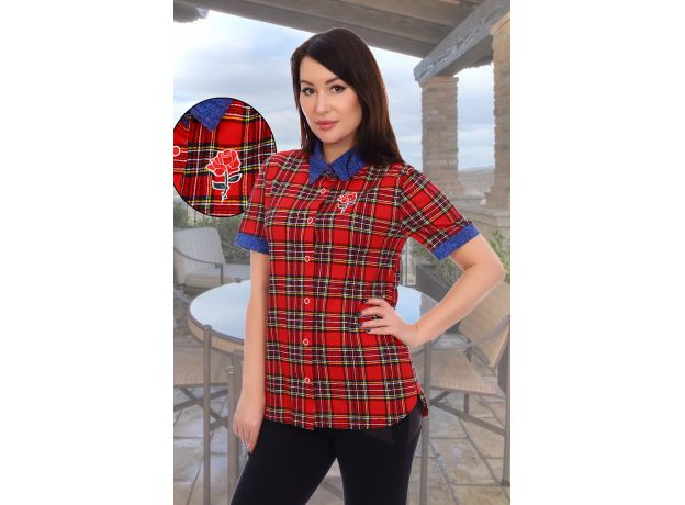Рубашка женская с коротким рукавом приталенного силуэта, фигурный низ. Воротник и низ рукава отделаны кулиркой под джинсовую ткань. На переде вышивка в виде розы
