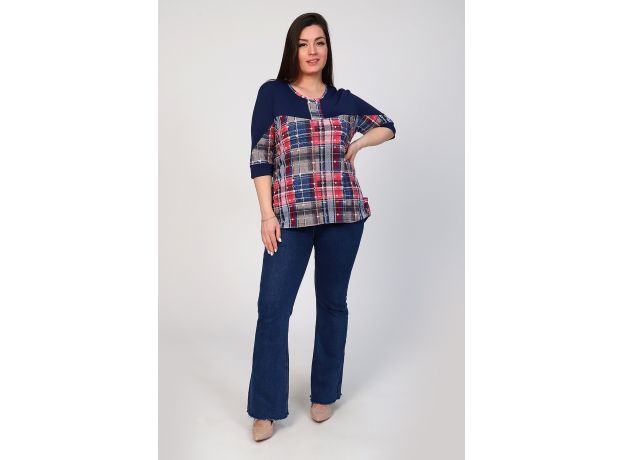 Туника прямого кроя, рукав 3/4 на манжете, вырез округлый отделан кантом. Передняя полочка на кокетке, низ изделия подобран на паты.