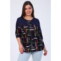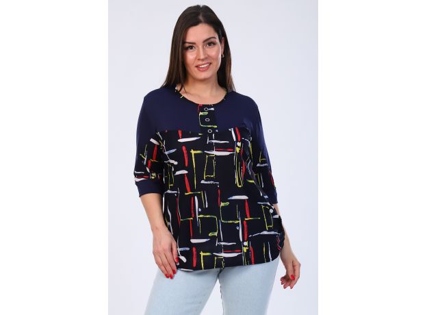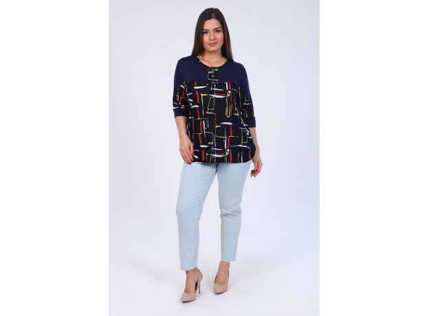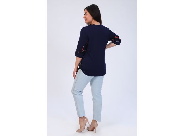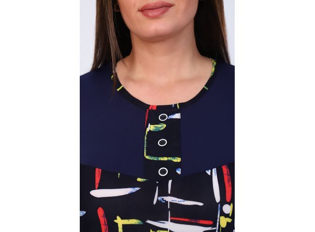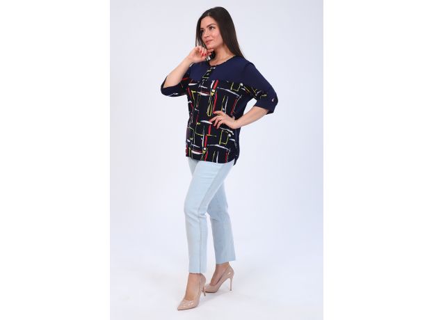 Туника прямого кроя, рукав 3/4 на манжете, вырез округлый отделан кантом. Передняя полочка на кокетке, низ изделия подобран на паты.