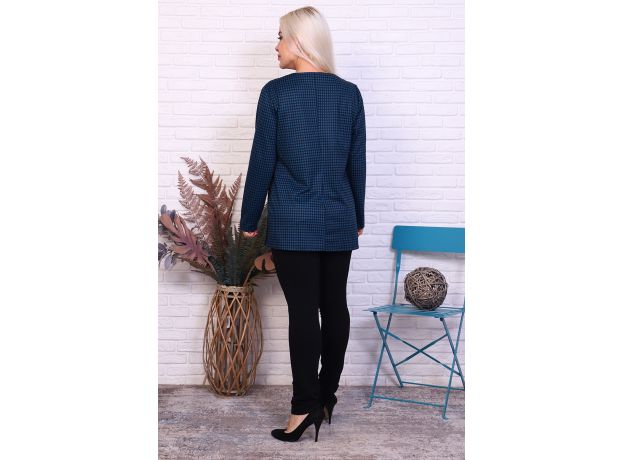 Туника приталенная. Округлая горловина. Рукав длинный. На полочке вставка из отделочной ткани  к низу с разрезом. На полочке декоративные стразы.