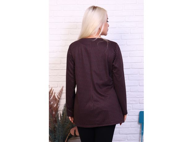 Туника приталенная. Округлая горловина. Рукав длинный. На полочке вставка из отделочной ткани к низу с разрезом. На полочке декоративные стразы.