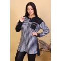 Туника комбинированная прямого кроя. Округлая горловина, в которую вставлены люверсы с декоративной цепью. Рукав длинный на манжете. На полочке накладной карман с декоративной лентой. Передняя полочка короче спинки. Удобна, практична, на каждый день.