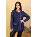 Туника женская приталенного кроя. На полочке вставка из однотонной ткани с декоративными пуговицами. Накладной карман с клапаном, карман и клапан обработан отделочной тканью. Округлый вырез, рукав длинный. По бокам изделия разрезы.