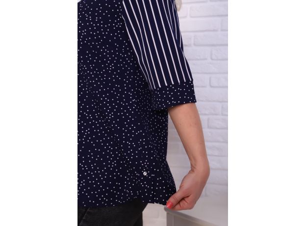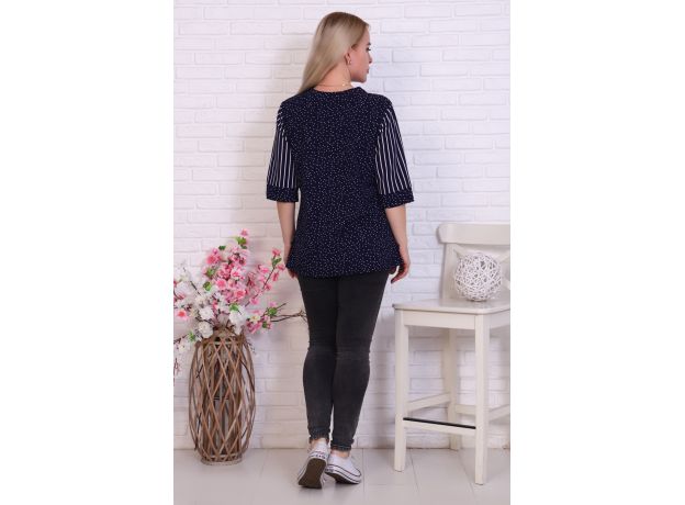 Дерзкое сочетание гороха и полоски не оставит равношушным не одну женщину. Основа туники - классический горох, отделана V-образной горловиной из полосатой ткани и рукавами подобранными на паты. Воротник-стойка.