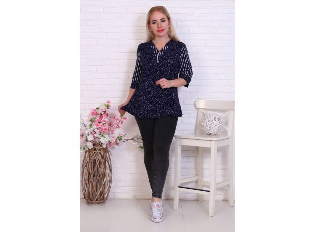 Дерзкое сочетание гороха и полоски не оставит равношушным не одну женщину. Основа туники - классический горох, отделана V-образной горловиной из полосатой ткани и рукавами подобранными на паты. Воротник-стойка.