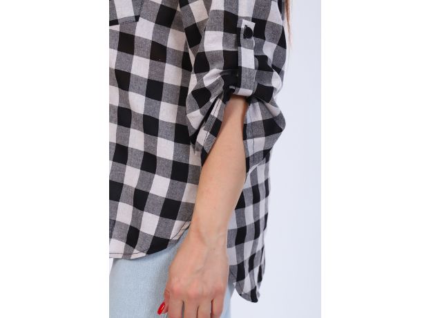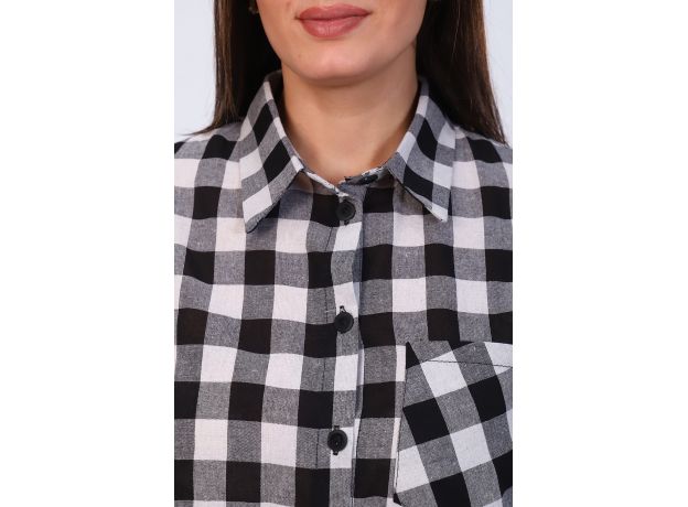 Повседневная, женская, туника свободного силуэта из набивного трикотажного полотна (штапель). Горловина круглая с отложным воротником. Спинка изделия, чуть длиннее полочки, низ изделия закруглен. На полочке рубашки расположен накладной нагрудный карман. Рукава укороченные, низ рукавов подобран на пату. Спинка цельнокроеная. Низ туники фигурный. Туника застегивается на пуговицы.