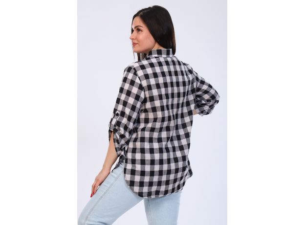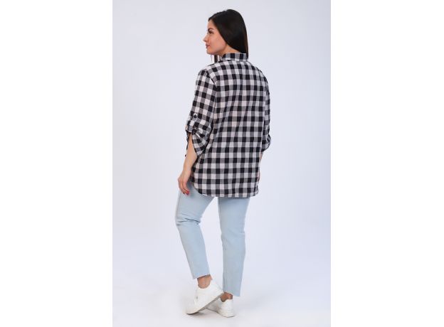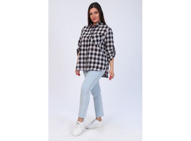 Повседневная, женская, туника свободного силуэта из набивного трикотажного полотна (штапель). Горловина круглая с отложным воротником. Спинка изделия, чуть длиннее полочки, низ изделия закруглен. На полочке рубашки расположен накладной нагрудный карман. Рукава укороченные, низ рукавов подобран на пату. Спинка цельнокроеная. Низ туники фигурный. Туника застегивается на пуговицы.
