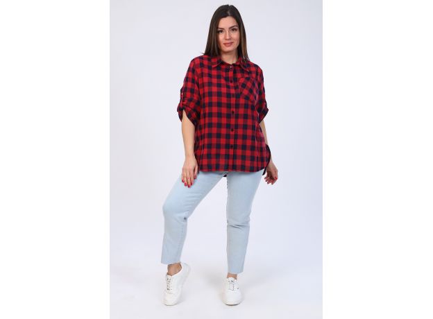 Повседневная, женская, туника  свободного силуэта из набивного трикотажного полотна (штапель). Горловина круглая с отложным воротником. Спинка изделия, чуть длиннее полочки, низ изделия закруглен. На полочке рубашки расположен накладной нагрудный карман. Рукава укороченные, низ рукавов подобран на пату. Спинка цельнокроеная. Низ туники фигурный. Туника застегивается на пуговицы.