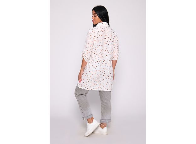 Туника рубашечного кроя с рисунком горох всегда актуальна, ее можно надеть как с джинсами, так и лосинами. Рукава подобраны на паты. Низ изделия фигурный.