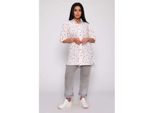 Туника рубашечного кроя с рисунком горох всегда актуальна, ее можно надеть как с джинсами, так и лосинами. Рукава подобраны на паты. Низ изделия фигурный.