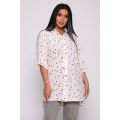 Туника рубашечного кроя с рисунком горох всегда актуальна, ее можно надеть как с джинсами, так и лосинами. Рукава подобраны на паты. Низ изделия фигурный.