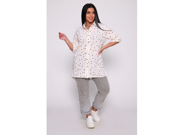 Туника рубашечного кроя с рисунком горох всегда актуальна, ее можно надеть как с джинсами, так и лосинами. Рукава подобраны на паты. Низ изделия фигурный.