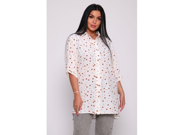 Туника рубашечного кроя с рисунком горох всегда актуальна, ее можно надеть как с джинсами, так и лосинами. Рукава подобраны на паты. Низ изделия фигурный.