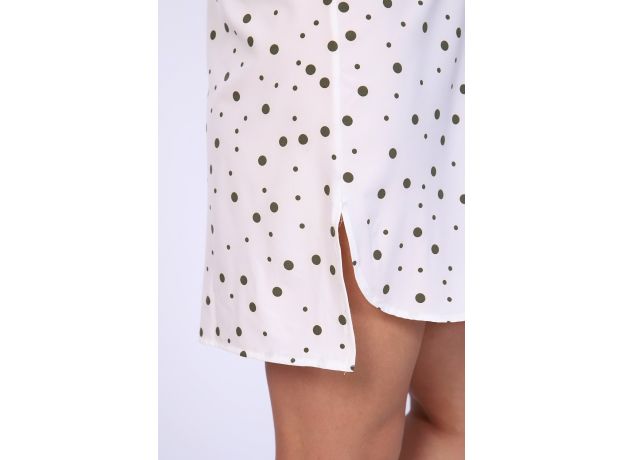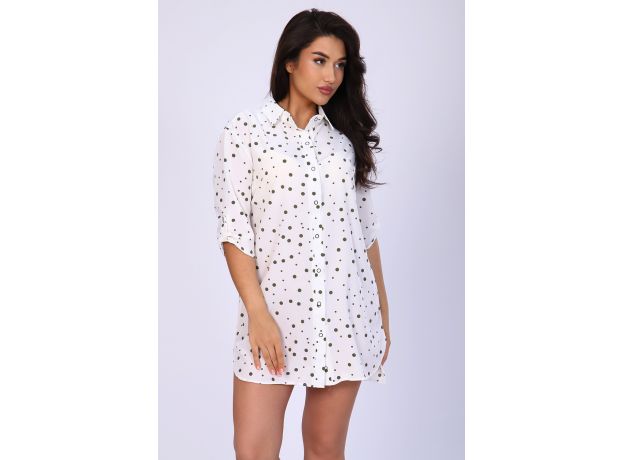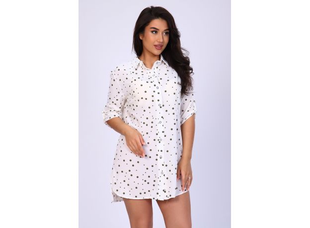 Туника рубашечного кроя с рисунком горох всегда актуальна, ее можно надеть как с джинсами, так и лосинами. Рукава подобраны на паты. Низ изделия фигурный.