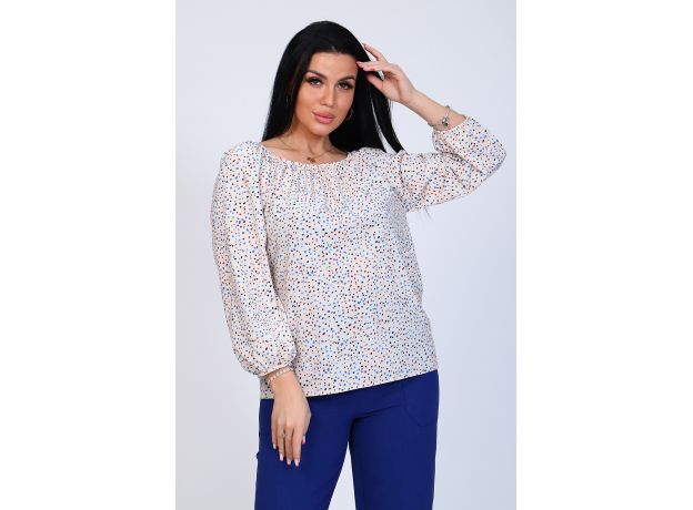 Легкая туника из приятной, немнущейся, отлично драпирующейся ткани индо. Свободный крой, горловина в стиле  кармен присборена на резинку, модный объемный рукав длиной 7/8 также присборен на резинку, что позволяет регулировать длину. Данная модель позволяет скрыть недостатки фигуры и обеспечивает свободу движения. В составе ткани есть вискоза, поэтому туника не электризуется и не липнет к телу.