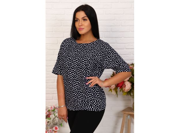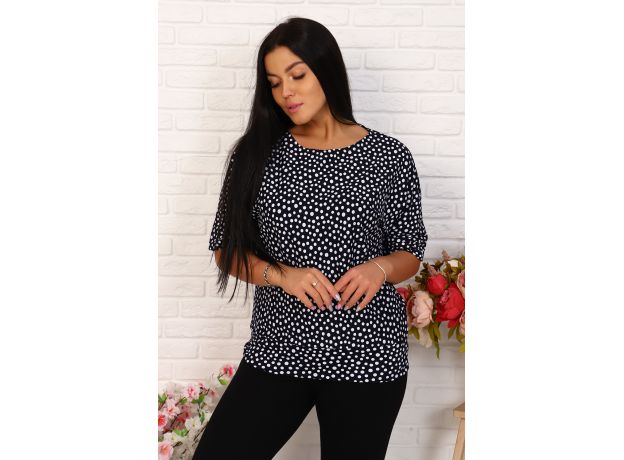 Туника женская силуэта летучая мышь. Вырез горловины лодочка, рукав короткий с манжетой. Рисунок - белый горошек на черном фоне придаст образу женственность и очарование.