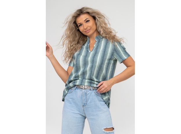 Женская туника-рубашка из 100% хлопчатобумажного полотна, сочетающая в себе всеми любимую полоску и не выходящий из моды горошек. Горловина с V - образным вырезом и воротником стойкой. Рукав и низ изделия с отделкой в виде полуколец, что делает тунику более привлекательной и по-своему красивой.