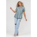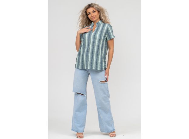 Женская туника-рубашка из 100% хлопчатобумажного полотна, сочетающая в себе всеми любимую полоску и не выходящий из моды горошек. Горловина с V - образным вырезом и воротником стойкой.