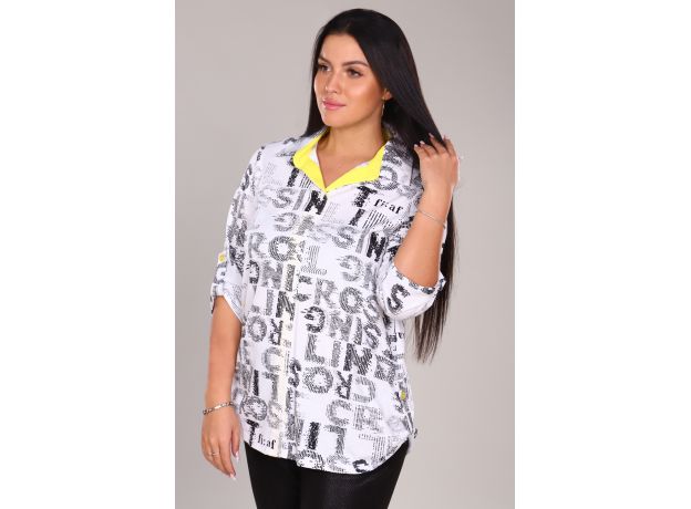 Туника-рубашка свободного кроя выполнена из 100% хлопчатобумажного полотна в 2-х цветах. Модель дополняют рубашечный воротник и паты, закреплённые на рукавах, и декоративные пуговицы по низу изделия. Неординарное решение стойки и планки, выполненных в контрастном жёлтом цвете - несущем нотки свежести, делает рубашку по-особенному привлекательной и стильной в современной моде. Данная модель является универсальным вариантом одежды, сочетающимся с любым предметом гардероба и вписывающимся как в строгий образ, так и в повседневный