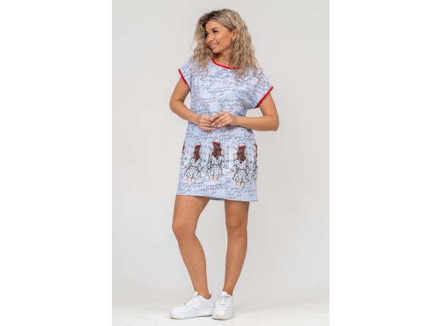 Женская туника прямого силуэта со спущенным плечом выполнена из 100% хлопчатобумажной ткани. Горловина и рукава обработаны ярким красным кантом, а  крупный купонный рисунок по краю ткани придаёт изделию по-своему оригинальный вид. Данная модель идеально подойдёт для дома и отдыха.
