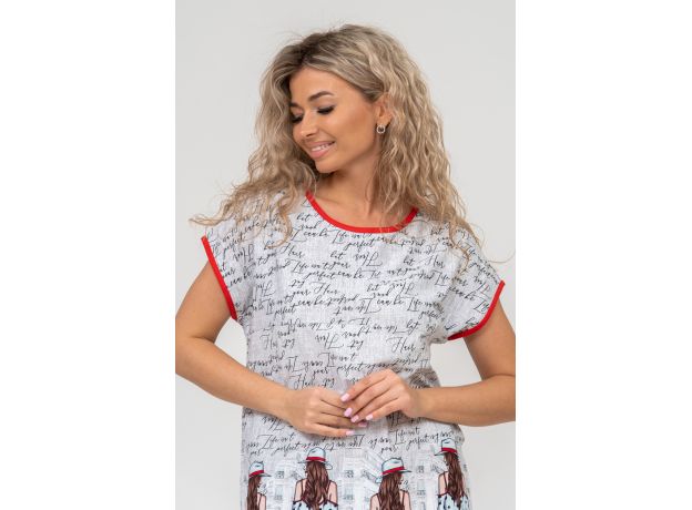 Женская туника прямого силуэта со спущенным плечом выполнена из 100% хлопчатобумажной ткани. Горловина и рукава обработаны ярким красным кантом, а крупный купонный рисунок по краю ткани придаёт изделию по-своему оригинальный вид. Данная модель идеально подойдёт для дома и отдыха.