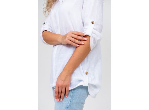 Женская туника - рубашка в стиле oversize выполнена из воздушного и опрятного к телу 2-х слойного жатого муслина. Материал идеально дышит, практически не ощущается на теле и быстро сохнет при намокании. Тунику дополняет стильный рубашечный воротник, рукав 3/4, паты с расстёгивающимися пуговицами, с помощью которых Вы можете носить модель в разных вариациях. Новая стилевая интерпретация сделала рубашку одной из базовых вещей, которая с разной одеждой смотрится неодинаково и всегда интересно и свежо. Хлопковая рубашка подойдёт взрослым  и подросткам. Великолепно будет смотреться дома, на прогулке, на празднике, в школе и на пляже. Модель такого плана идеально подойдёт и в качестве подарка для себя и своих любимых! Стирать муслиновые вещи нужно только в теплой воде при температуре не выше 40С.