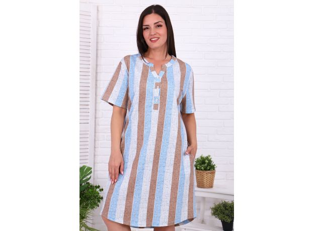 Туника полуприлегающего силуэта с V-образным вырезом горловины. По переду планка-застежка, в боковых швах карманы. Рукав короткий. Длина средняя.