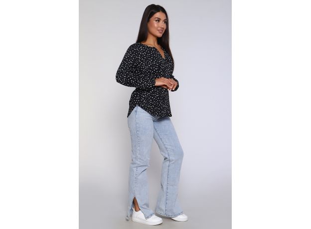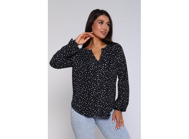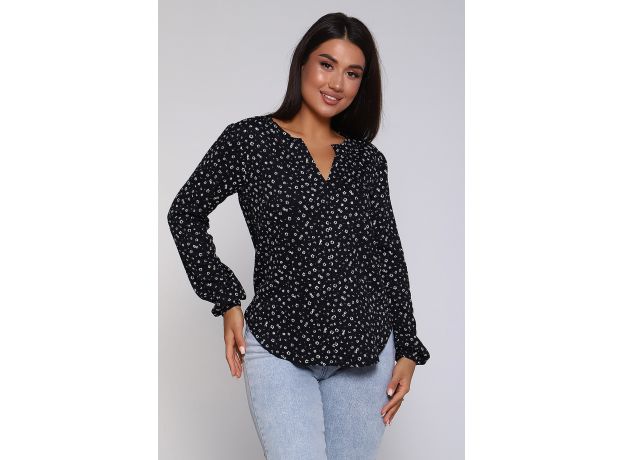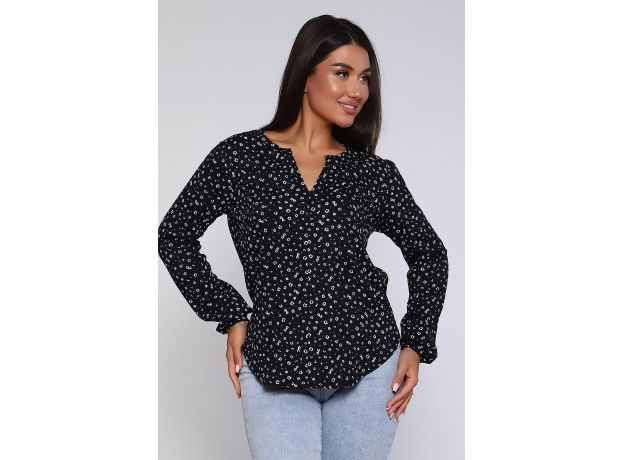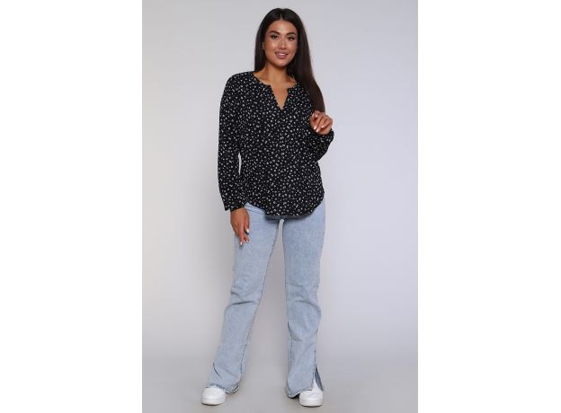 Элегантная, женственная туника в романтическом стиле, свободного силуэта с V-образным вырезом горловины, с воротником стойка. Длинный рукав на манжете. Низ округлый. Модель для тех, кто чувствует себя истинной леди.