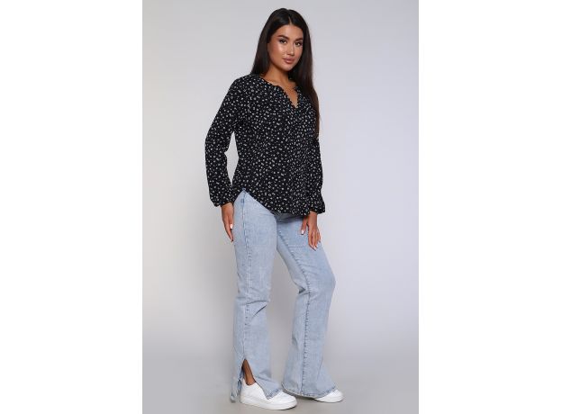 Элегантная, женственная туника в романтическом стиле, свободного силуэта с V-образным вырезом горловины, с воротником стойка. Длинный рукав на манжете. Низ округлый.