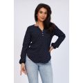 Элегантная, женственная туника в романтическом стиле, свободного силуэта с V-образным вырезом горловины, с воротником стойка. Длинный рукав на манжете. Низ округлый.