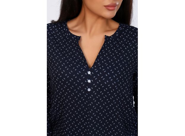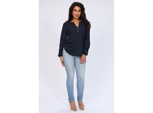 Элегантная, женственная туника в романтическом стиле, свободного силуэта с V-образным вырезом горловины, с воротником стойка. Длинный рукав на манжете. Низ округлый. Модель для тех, кто чувствует себя истинной леди.