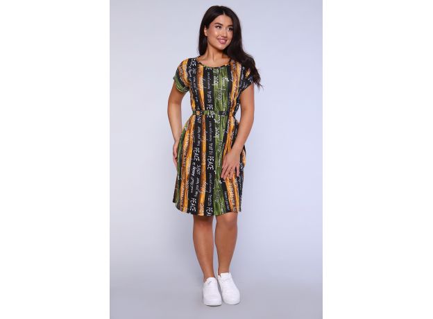 Туника женская, полуприлегающего силуэта с коротким рукавом без карманов, на поясе, с круглым вырезом горловины. Длина изделия по колено.