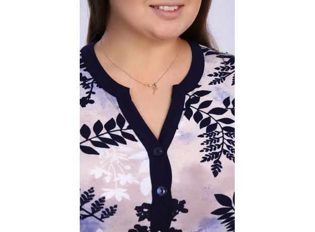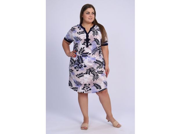 Туника с застежкой по груди с V-образной планкой, с короткими рукавами и боковыми карманами. Длина по колено.