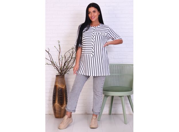 Стильная полосатая туника из вискозы. Короткие рукава, застегивается на пуговицы, на груди декоративный клапан кармана, дизайн в виде светлых и темных полосок. Размеры от 52 до 62.