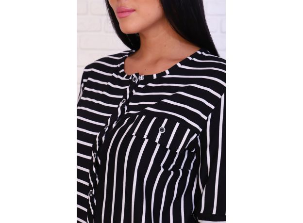 Стильная полосатая туника из вискозы. Короткие рукава, застегивается на пуговицы, на груди декоративный клапан кармана, дизайн в виде светлых и темных полосок. Размеры от 52 до 62.