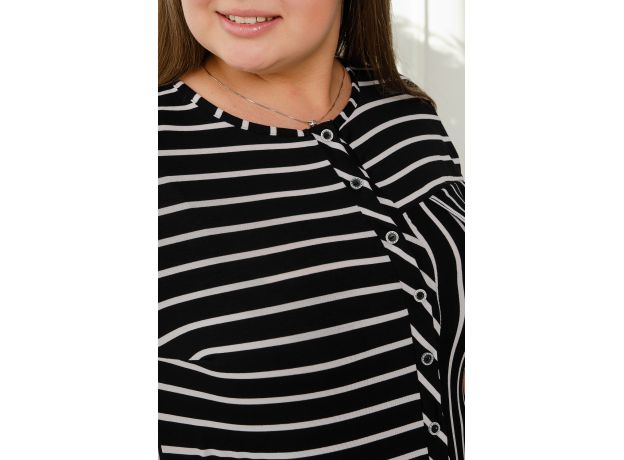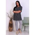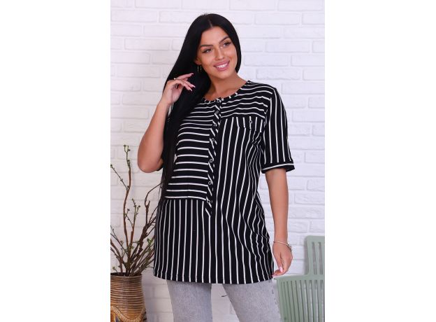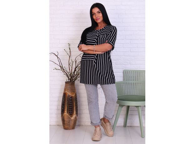 Стильная полосатая туника из вискозы. Короткие рукава, застегивается на пуговицы, на груди декоративный клапан кармана, дизайн в виде светлых и темных полосок. Размеры от 52 до 62.