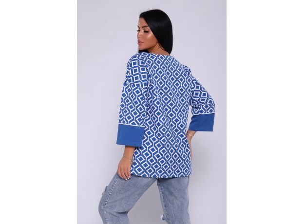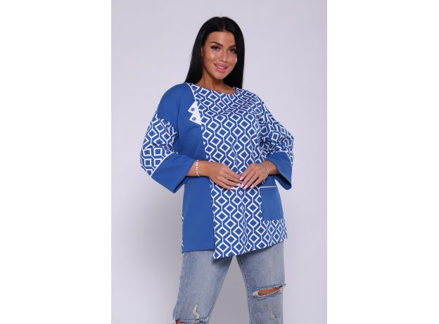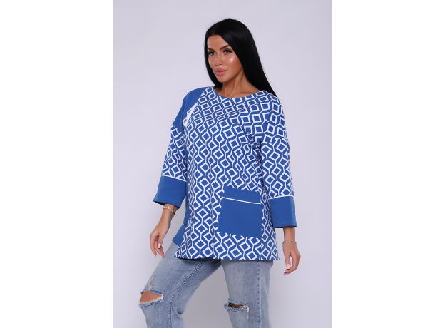 Стильная женская туника из комбинированного футера со спущенным плечом. Рукав 3/4 с отделочной деталью по низу. На полочке накладной карман. Декор - пуговицы. Можно комбинировать как с брюками, так и с юбкой.