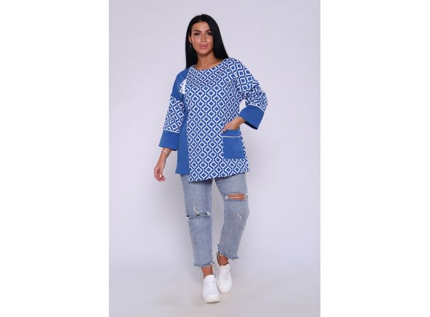 Стильная женская туника из комбинированного футера со спущенным плечом. Рукав 3/4 с отделочной деталью по низу. На полочке накладной карман. Декор - пуговицы. Можно комбинировать как с брюками, так и с юбкой.