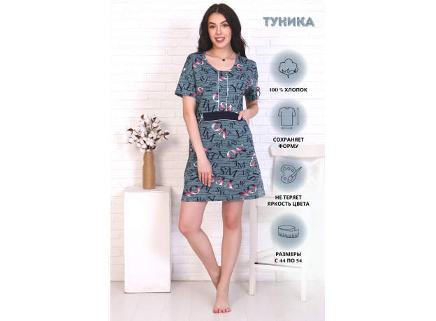 Стильная женская туника из кулирного полотна, горловина круглая, рукав короткий, карманы с отрезными бочками в нижней части полочки, низ изделия обработан на плоскошовной машине. Благодаря натуральному составу ткань позволяет коже дышать. Удобная модель на каждый день, а так же для прогулок и отдыха.