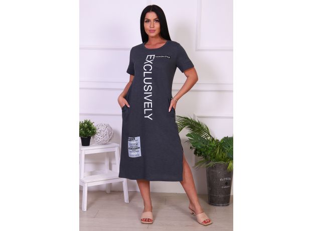 Туника женская из кулирного полотна, прямой силуэт, горловина круглая, рукав короткий, втачной, в боковых швах внутренние карманы, сбоку разрез, низ изделия обработан на плоскошовной машине, на полочке принт.