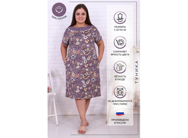 Туника женская из кулирного полотна, прямого кроя, горловина круглая, рукав-реглан, в боковых швах внутренние карманы. Изделие легкое в уходе. Благодаря натуральному составу ткань позволяет вашей коже дышать. Туника прекрасно подойдет для дома, дачи, прогулок и отдыха.