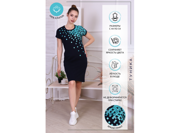 Туника женская из кулирного полотна, горловина круглая, спущенное плечо, в боковых швах внутренние карманы, низ изделия обработан на плоскошовной машине, на полочке принт. Изделие легкое в уходе. Благодаря натуральному составу ткань позволяет вашей коже дышать. Туника прекрасно подойдет для дома, дачи, прогулок и отдыха.