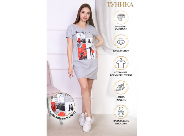 Стильная женская туника из кулирного полотна, прямого кроя, спущенное плечо, в боковых швах внутренние карманы, низ изделия обработан на плоскошовной машине, на полочке принт. Туника прекрасно подойдет на каждый день.