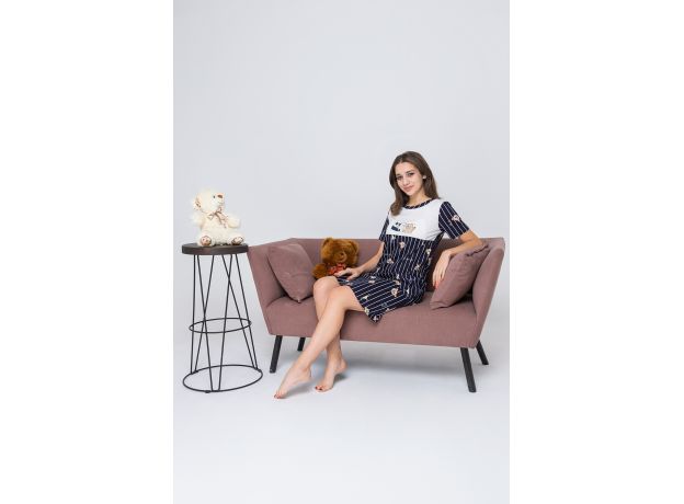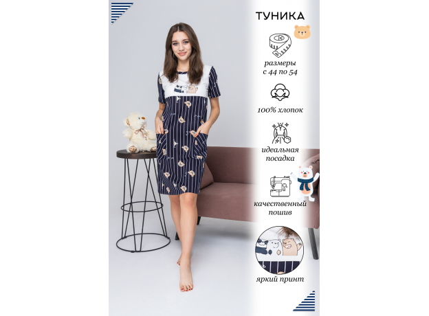 Туника женская из кулирного полотна, горловина круглая, рукав короткий, втачной, накладные карманы, низ изделия обработан на плоскошовной машине, на полочке принт. Изделие легкое в уходе, выполнено из 100% хлопка. Туника прекрасно подходит на каждый день.