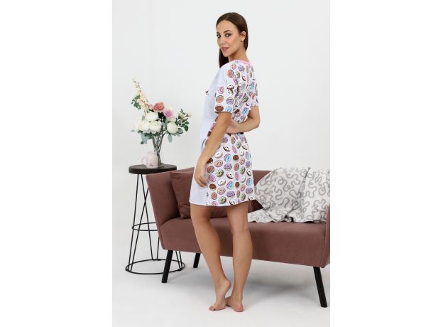 Туника женская из кулирного полотна, горловина круглая, рукав короткий, втачной, спущенное плечо, в боковых швах внутренние карманы, низ изделия обработан на плоскошовной машине, на полочке принт. Благодаря натуральному составу вам будет уютно. Изделие подходит для повседневной носки, легкое в уходе. Цвет окантовки может отличаться