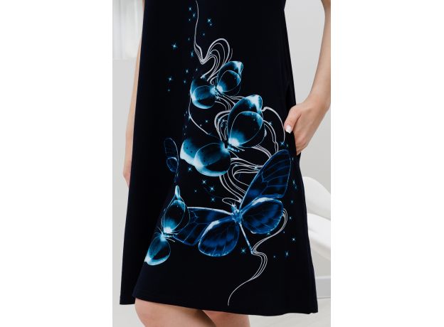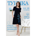 Туника женская из кулирного полотна с расклёшенным подолом книзу, горловина круглая, рукав короткий, втачной, на полочке принт, в боковых швах карманы, низ изделия обработан на плоскошовной машине. Изделие легкое в уходе. Благодаря натуральному составу ткань позволяет вашей коже дышать. Туника прекрасно подойдет для дома, дачи, прогулок и отдыха.